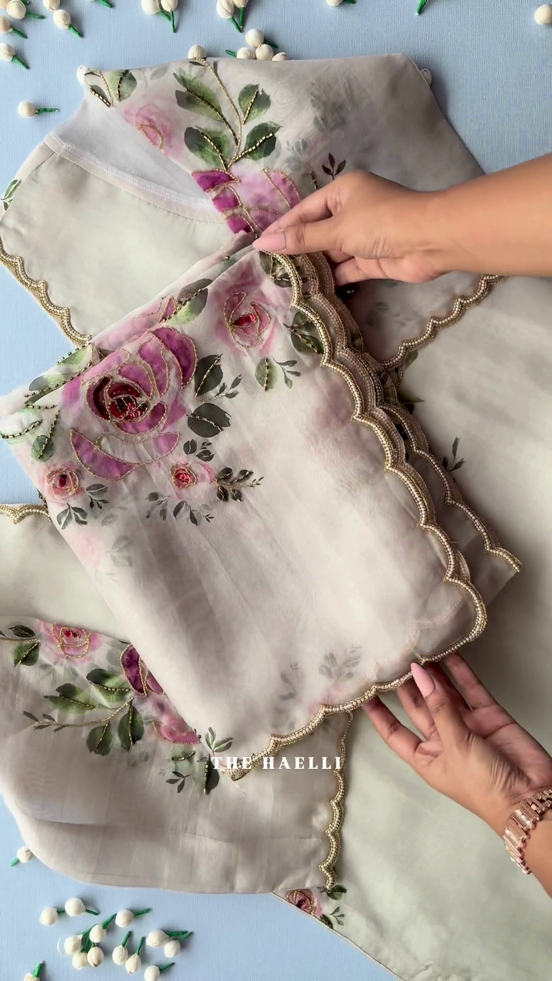 The highlight of this outfit is its delicate handwork-inspired floral embroidery in soothing pink tones, enhanced with intricate detailing and fine craftsmanship. The neckline and borders are adorned with elegant scalloped lace and golden accents, adding a touch of luxury and refinement to the entire ensemble.